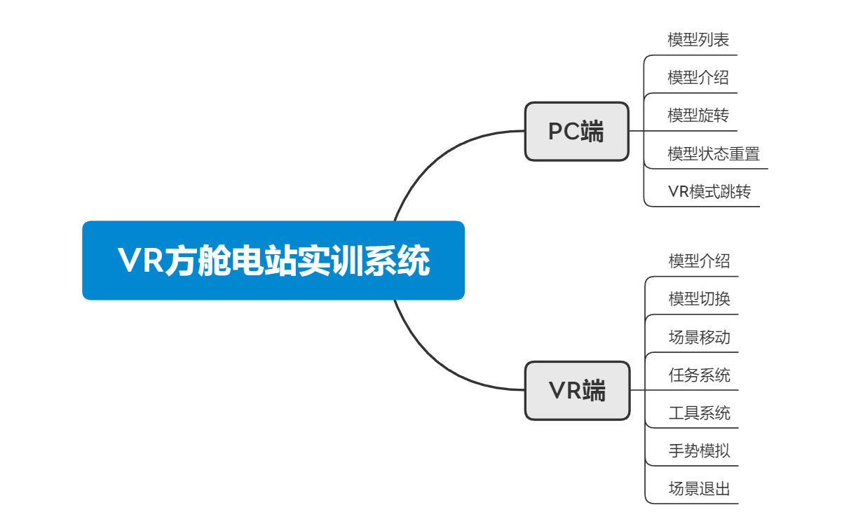產品共分為PC端和VR端兩大模塊。PC端主要用于對方艙電站結構理論知識的認知;VR端主要用于對方艙電站進行模擬實訓操作,具體內容主要有:開機準備與檢查、方艙電站維護保養、巡檢巡修、故障排查處理等。
