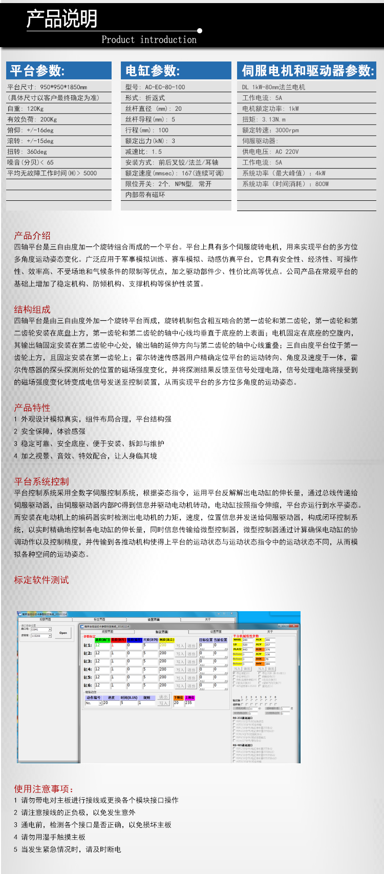 四軸平臺是三自由度加一個旋轉組合而成的一個平臺。平臺上具有多個伺服旋轉電機,用來實現平臺的多方位多角度運動姿態變化。廣泛應用于軍事模擬訓練、賽車模擬、動感仿真平臺,它具有安全性、經濟性、可操作性、效率高、不受場地和氣候條件的限制等優點,加之驅動部件少、性價比高等優點。公司產品在常規平臺的基礎上增加了穩定機構、防傾機構、支撐機構等保護性裝置。