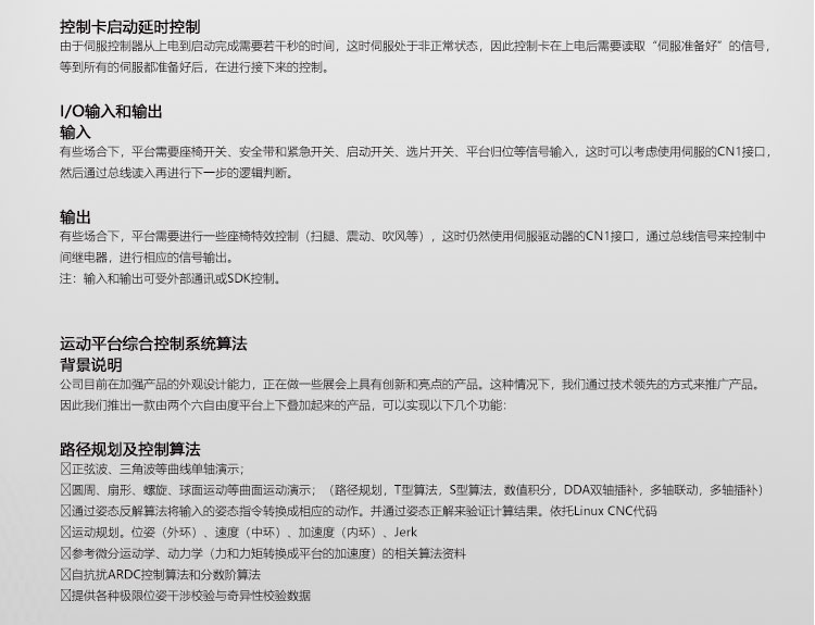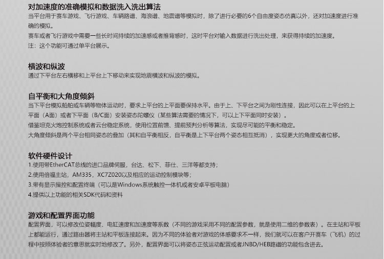 答: 我公司主要從事仿真平臺(tái)、六自由度平臺(tái)和運(yùn)動(dòng)平臺(tái)控制卡的研發(fā)、生產(chǎn)與銷售,同時(shí)承接大型4D/5D/7D影院等工程。專注技術(shù)領(lǐng)先,提升用戶體驗(yàn)是我們的追求!