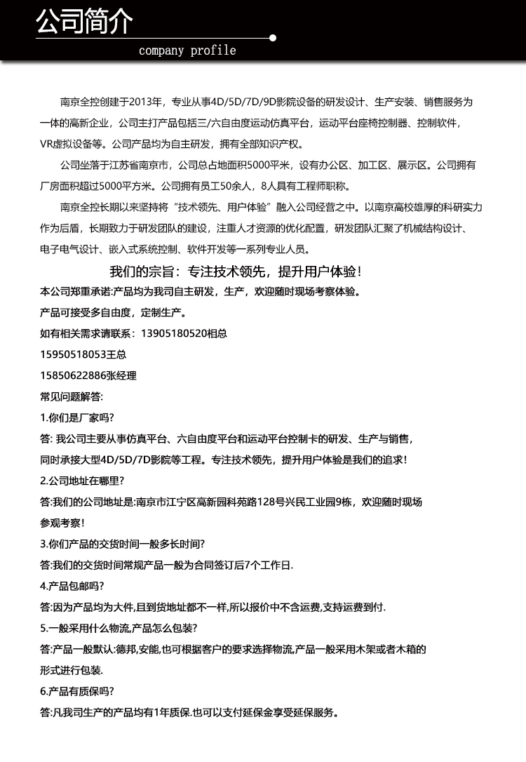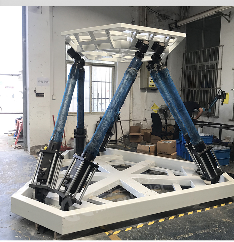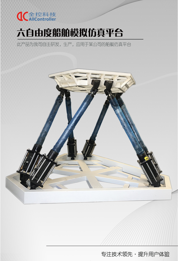 在艦艇仿真這一領域,南京全控航空科技有限公司是國內首屈一指的行業專家,專業從事三/六自由度運動仿真平臺的開發,賽車/飛行游戲平臺、地震仿真平臺等。旗下的六自由度運動平臺是由六支電動缸,上、下各六只萬向鉸鏈和上、下兩個平臺組成,下平臺固定在基礎上,借助六支電動缸的伸縮運動,完成上平臺在空間六個自由度的運動,從而可以模擬出各種空間運動姿態。六自由度運動平臺涉及到機械、液壓、電氣、控制、計算機、傳感器,空間運動數學模型、實時信號傳輸處理等一系列高科技領域,因此六自由度運動平臺是控制領域水平的標志性象征。主要包括平臺的空間運動機構、空間運動模型、液壓系統、控制系統??蓮V泛應用到各種訓練模擬器,如艦艇模擬器等。