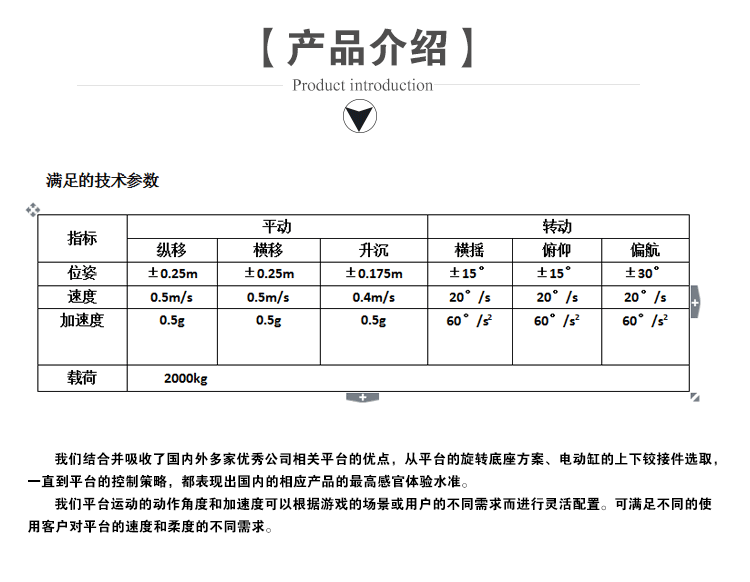 我們結(jié)合并吸收了國內(nèi)外多家優(yōu)秀公司相關平臺的有點,從平臺的旋轉(zhuǎn)底座方案、電動缸的上下鉸接件選取,一直到平臺的控制策略,都表現(xiàn)出國內(nèi)的相應產(chǎn)品的最高感官體驗水準。