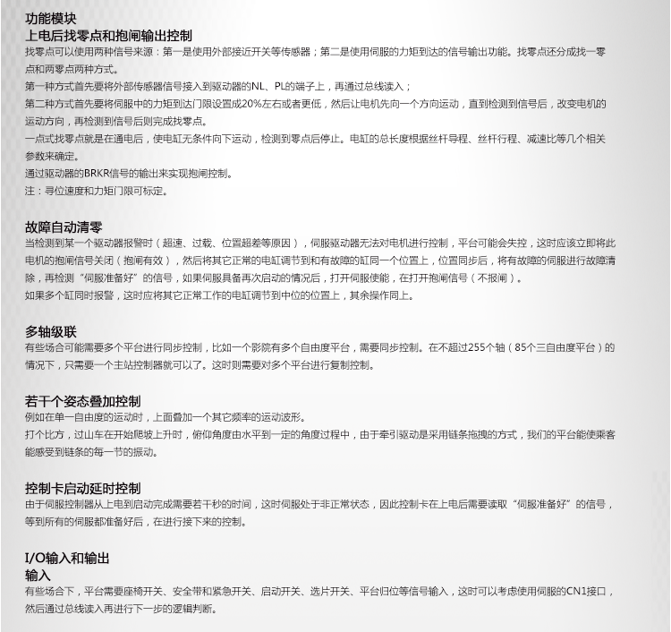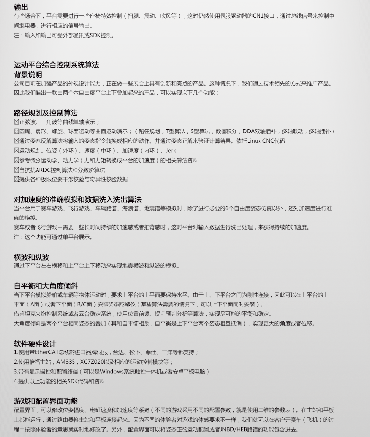 答: 我公司主要從事仿真平臺(tái)、六自由度平臺(tái)和運(yùn)動(dòng)平臺(tái)控制卡的研發(fā)、生產(chǎn)與銷售,同時(shí)承接大型4D/5D/7D影院等工程。專注技術(shù)領(lǐng)先,提升用戶體驗(yàn)是我們的追求!