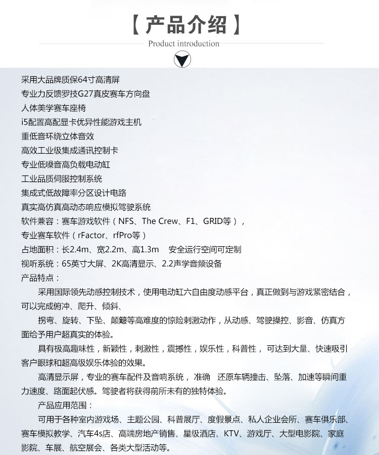 可用于各種室內(nèi)游戲場、主題公園、科普展廳、度假景點(diǎn)、私人企業(yè)會所、賽車俱樂部、賽車模擬教學(xué)、汽車4s店、高端房地產(chǎn)銷售、星級酒店、KTV、游戲廳、大型電影院、家庭影院、車展、航空展會、各類大型活動等。
