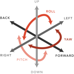 首先,您應該知道物體可以在三維空間中移動的六個自由度(DOF)。六個角度是(1)向前/向后,(2)向上/向下,(3)左/右,(4)偏航,(5)俯仰和(6)滾動。它們聽起來都相同或相似,不是嗎?