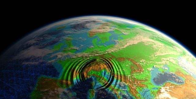 畫面為震源到地表的剖面圖,模擬地震波從震源到地表的傳遞的過程,紅色代表縱波、綠色代表橫波;根據橫波和縱波的傳播速度和時間...