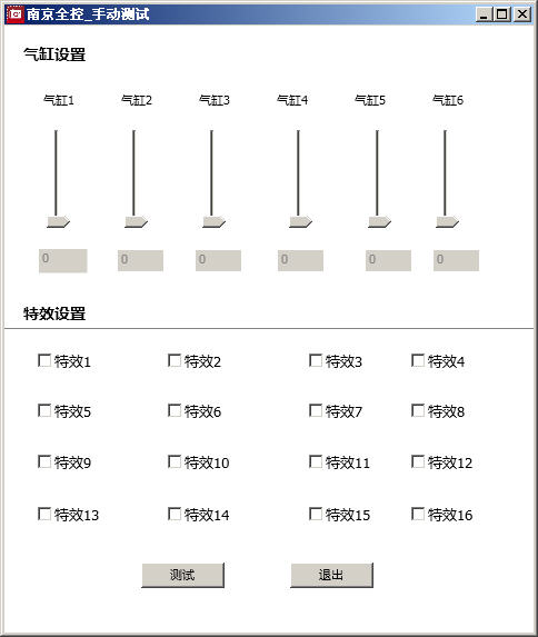 測(cè)試電缸/油缸:在測(cè)試界面上,將“氣缸設(shè)置”下方的“缸1”中的滾動(dòng)條向上拖動(dòng),這時(shí)平臺(tái)的1號(hào)位置的電缸/油缸會(huì)上升到相應(yīng)的位置;向下拖動(dòng)時(shí),1號(hào)缸會(huì)下降到相應(yīng)的位置。依次按此操作測(cè)試缸2、缸3、缸4、缸5、缸6。如果都能正常上升和下降,則平臺(tái)工作正常。