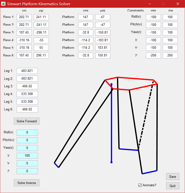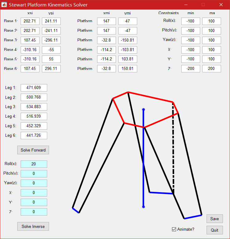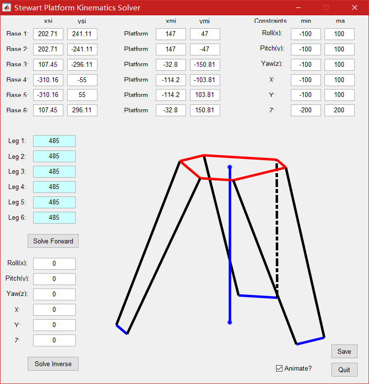 將Stewart平臺鉸接點(diǎn)參數(shù)帶入到上述公式中,使用MATLAB求得在初始位姿下,如圖2.22.1所示,六根桿長和設(shè)計(jì)時的參數(shù)一致。