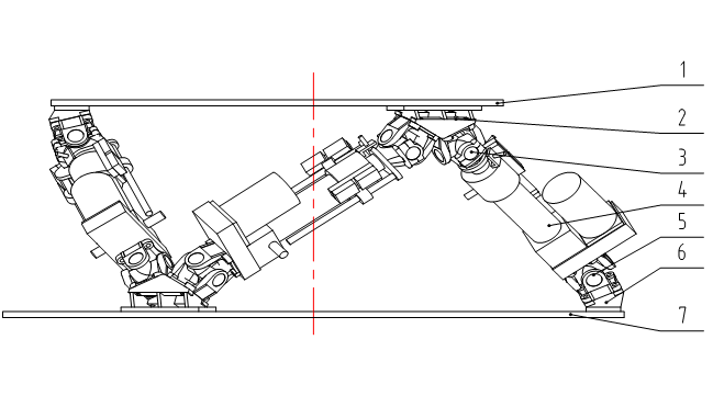 1平臺上底板、2上鉸支座連接座、3上鉸支座組件、4電動缸組件、5下鉸支座組件、6下鉸支座連接座、7平臺下底板。