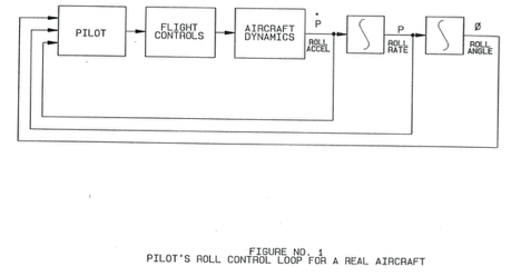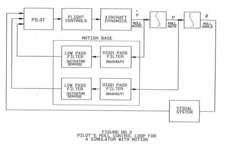 并且可以采用分析方法來準確了解就飛行員而言運動基座在做什么。圖1顯示了實際飛機的飛行員側傾控制回路的框圖。飛行員從飛機上得到提示,告訴他飛機在做什么。側傾加速度和速度提示是“褲子座位”中的主要提示,而側傾角度提示則完全可見。誠然,飛行員可以從窗外看到一些速度提示,但是在瞬態條件下,飛行員很難,因為他必須通過心理上的區分來得出速度。飛行員無法通過向窗外看來獲得加速度提示。