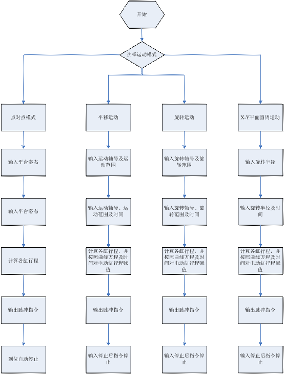 根據六自由度平臺的運動狀態,計算出各電動缸的相應位置和速度指令信號,從而控制運動平臺的動作,保證按照預定的軌跡運動;當運動平臺到達要求的位置時,各電動缸的速度指令信號給定為零,運動平臺就立刻停下來,達到了點位控制的目的。